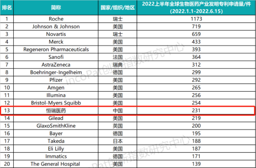 近日,全球专利数据库incoPat创新指数研究中心发布全球生物医药发明专利TOP100榜单,凯发娱乐医药以上半年231件发明专利申请量位列榜单第13名,是唯一一家进入TOP20的中国药企。
