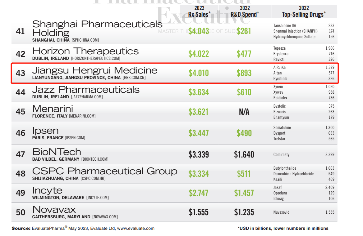 6月10日,美国《制药经理人》杂志(PharmExec)公布了2023年全球制药企业TOP50榜单,凯发娱乐医药连续第五年进榜,且今年榜单披露的上榜企业2022年研发投入显示,凯发娱乐医药以8.93亿美元位居上榜中国药企首位。