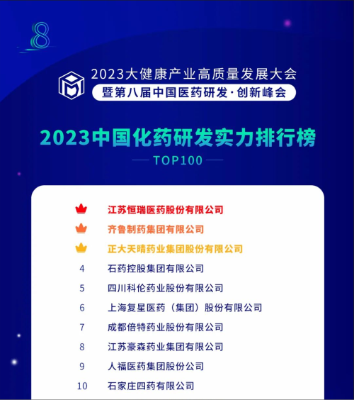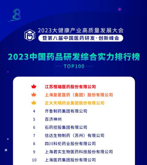 由药智网、中国药业杂志社主办的2023大健康产业高质量发展大会暨第八届中国医药研发•创新峰会于6月16日开幕,会上发布了《2023中国药品研发实力排行榜》系列榜单,凯发娱乐医药凭借深厚的创新研发实力再创辉煌:荣登《2023中国药品研发综合实力排行榜TOP100》榜首、《2023中国化药研发实力排行榜TOP100》榜首。值得一提的是,今年是凯发娱乐医药连续第6年入选《中国药品研发综合实力排行榜》榜首。